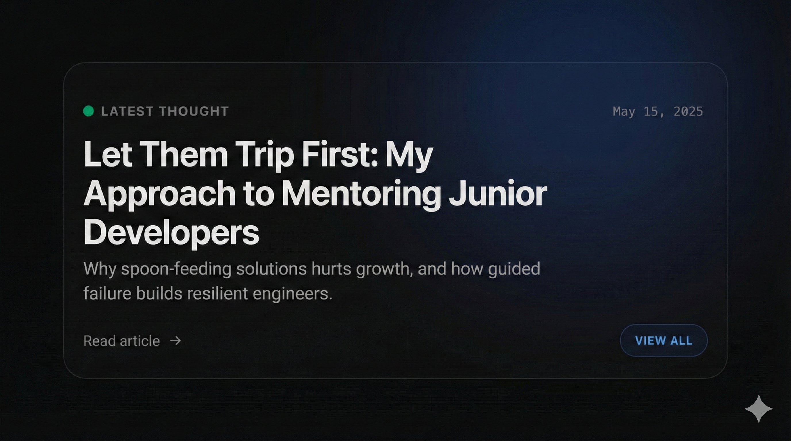A firsthand look at how I give new developers just enough rope to explore, make mistakes, and emerge stronger without letting the project burn down.